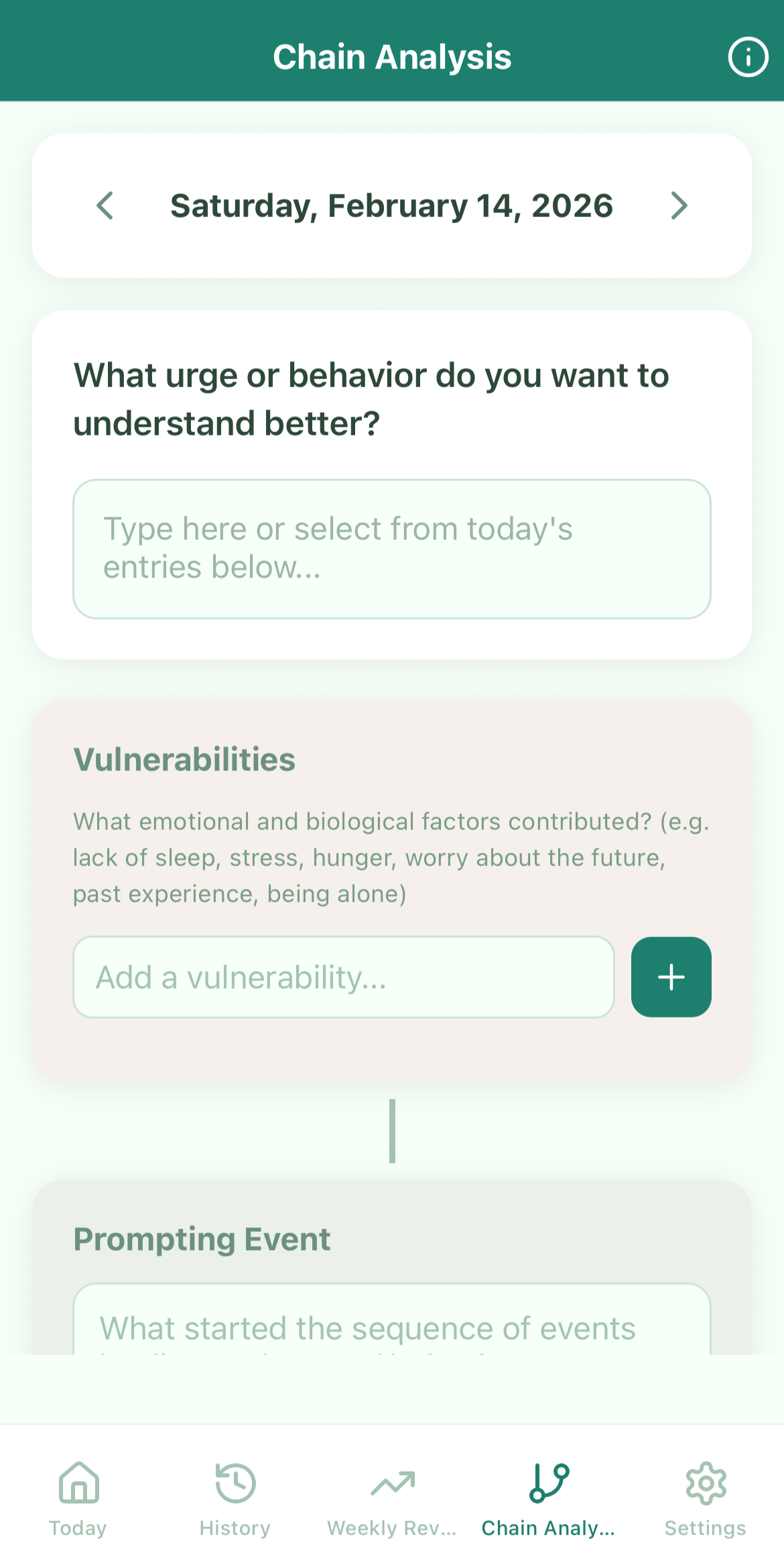 The Chain Analysis is your tool for understanding your urges and behavior. Better understand a challenging moment in your day, by adding in vulnerabilities, prompting event, links in the chain, and consequences. Any information you previously entered in your recording will be pre-filled to make it quick and easy!