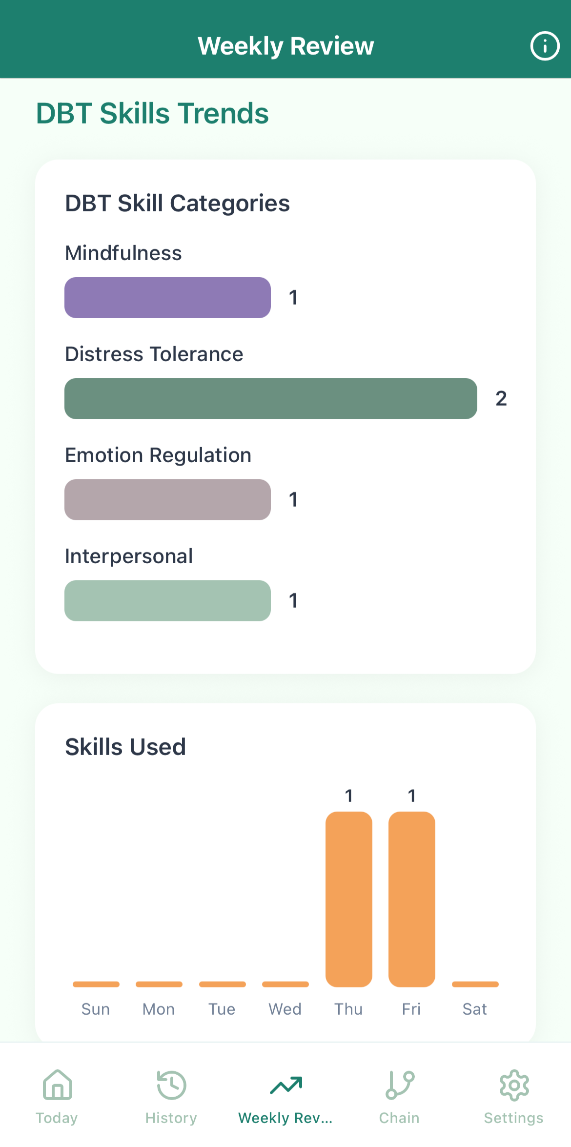 Get immediate stats on your skill use, and the relationship between your emotions and urges or behaviors. This will help you better understand your skills practice and patterns throughout the week.
