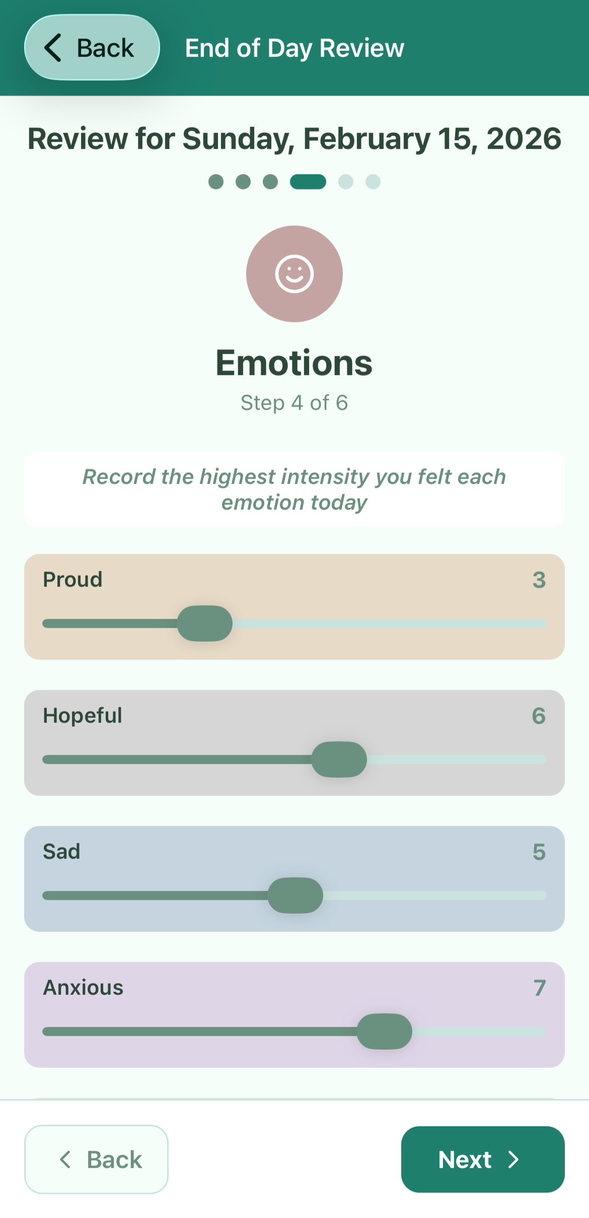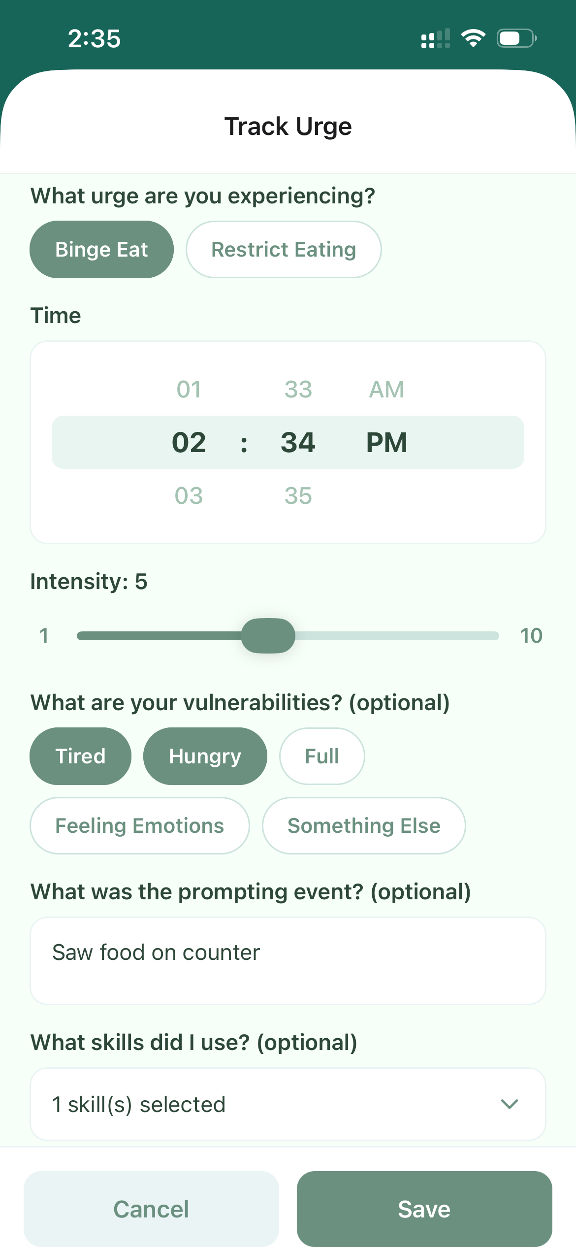 Your End of Day Review is a catch-all time for you to reflect on the day and making observations. You’ll be prompted to record your meals, rate the highest intensity of your urges throughout the day, record your behaviors, and finally your DBT skill use. Any entires you recorded earlier in the day will be automatically pre-filled so you’re not starting from scratch. You can also include any additional notes for the day.