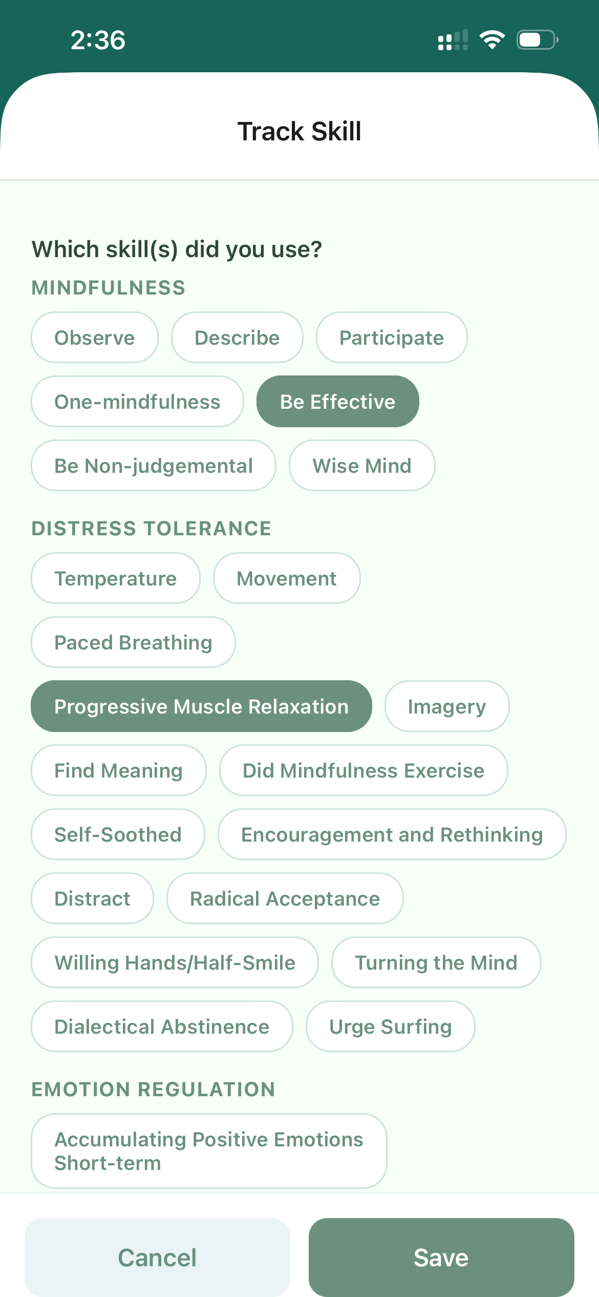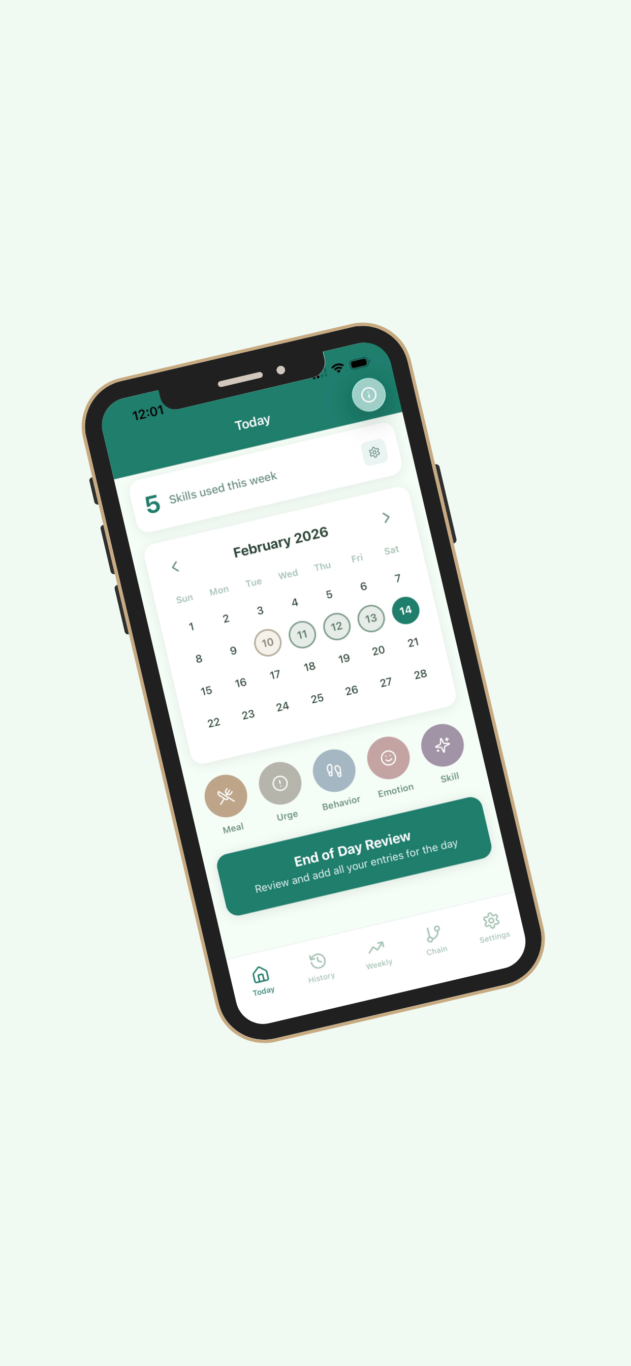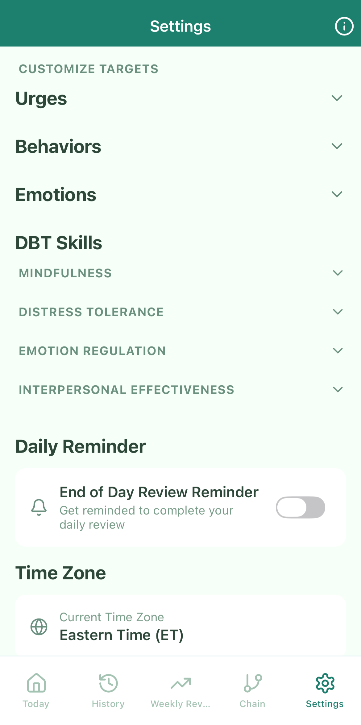 Everyone’s journey is unique! Customize your urges, behaviors, emotions, and the DBT skills you want to track in your settings. This will inform what targets you will be prompted with for in-the-moment recording and with your end of day review.