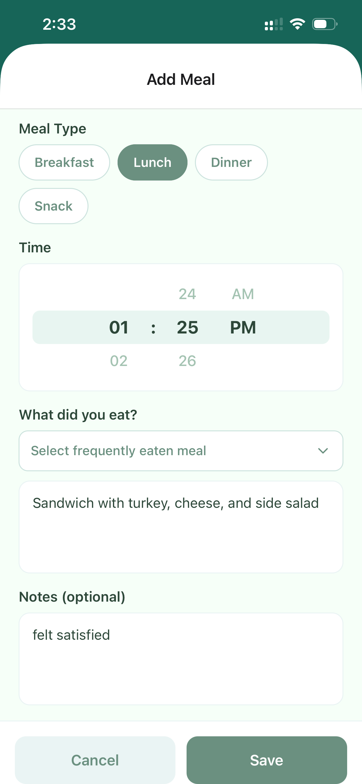 Record what you ate for breakfast, lunch, dinner, and snacks throughout the day, along with your time of eating, and any additional notes. Quickly and easily select frequently meals without having to type in a new entry.
